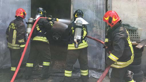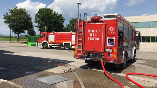 CAMERI-13-07-2019- Incendio in un capannone di via Matteotti a Cameri oggi pomeriggio, sabato 13 luglio. Due squadre dei vigili del fuoco, una di Novara ed una di Borgomanero con due autobotti sono intervenute per spegnere le fiamme divampate in un capannone al cui interno si trovavano due camion e varie auto e motorini. La fase critica si è conclusa con lo spegnimento e la messa in sicurezza dell'area, che ha visto il necessario raffreddamento anche per tre bombole di acetilene, un gas altamente infiammabile ed esplosivo, che si trovavano in un capannone adiacente.