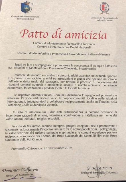 in cui si è ricordata la vicinanza e la fratellanza che lega le due comunità: quella di Premosello e di Montefortino che ci porterà nei prossimi mesi al gemellaggio. Tanta gente, un momento veramente emozionante. Ringrazio tutti coloro che hanno permesso questa toccante celebrazione". Così il sindaco di Premosello, Giuseppe Monti a commento della giornata che ha visto la comunità ossolana e quella marchigiana stringere un patto d'amicizia che culminerà, appunto, A unire Premosello al comune del Parco Nazionale dei Monti Sibillini, fu nel 2016 il sisma, pertanto Montefortino fu la destinazione di due missioni da parte della protezione civile premosellese.